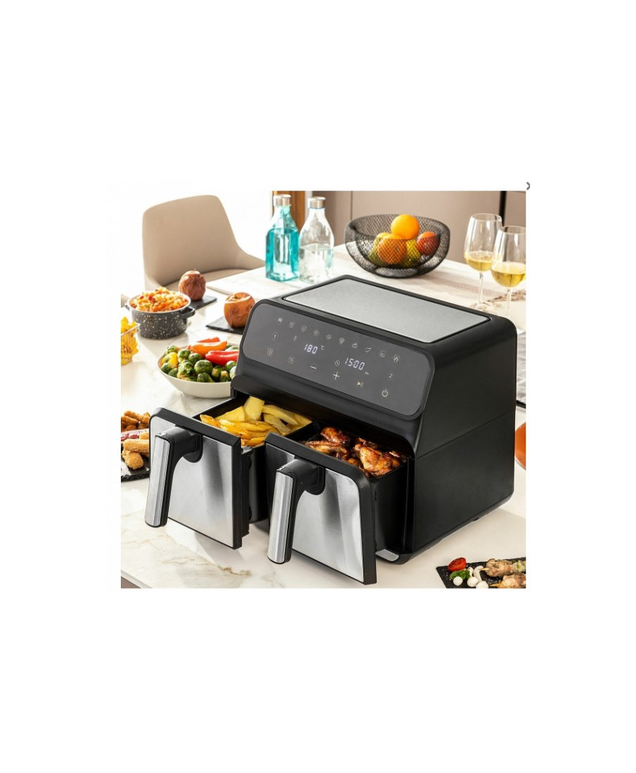 La friteuse à air de 3 400 W et 2 paniers de 4 L chacun, permet de faire cuire 2 repas simultanément en un temps record. Elle est facile à nettoyer et possède une protection contre la surchauffe.